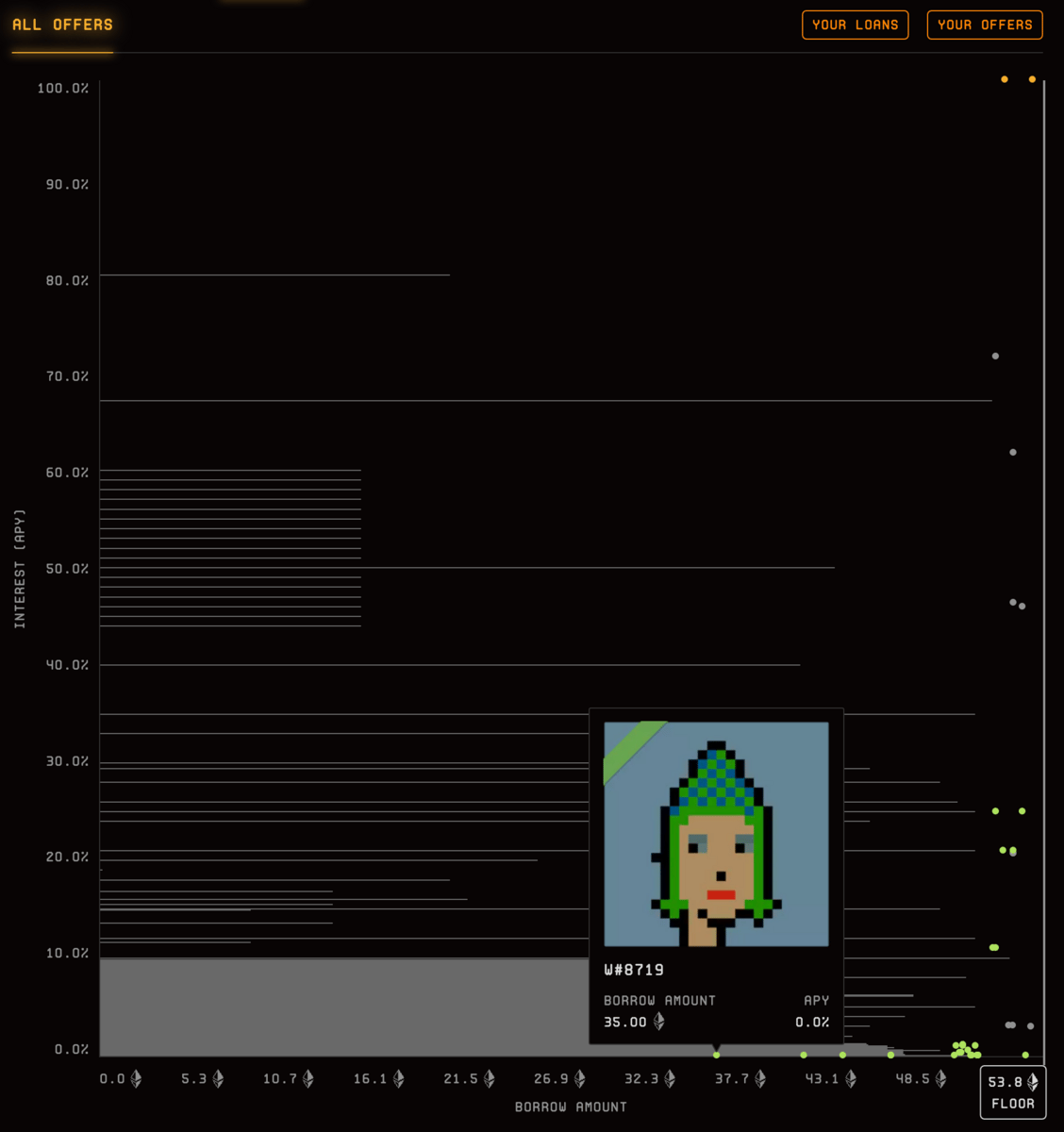 It’s a peer-to-peer lending protocol with market determined interest rates and no oracle dependency (i.e. no need to ping Chainlink to see what the collection price is). People can take loans against their NFTs and then use the ETH elsewhere or to lever up and buy more NFTs. There is no due date or fixed liquidation price like BendDao has.