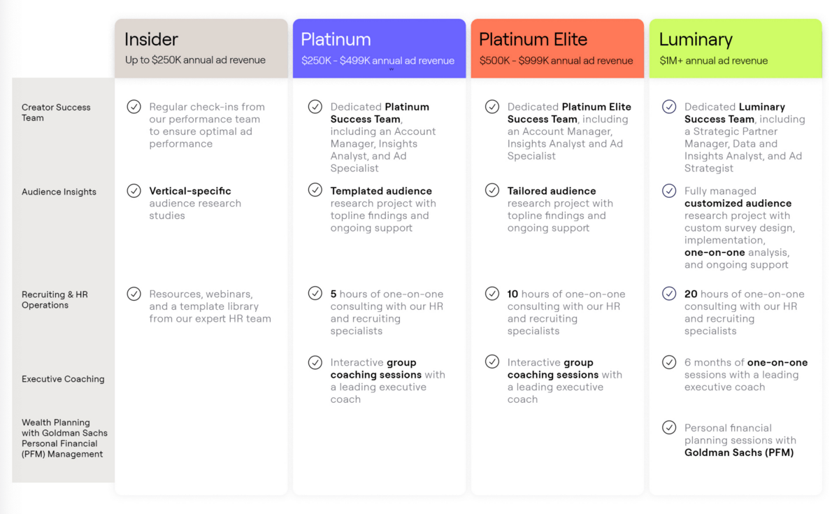 They’ve launched creator levels where you get additional benefits based on how much ad revenue you generate, such as SEO support, customized email marketing strategies, recruiting and HR operations consulting, executive coaching and even wealth management: