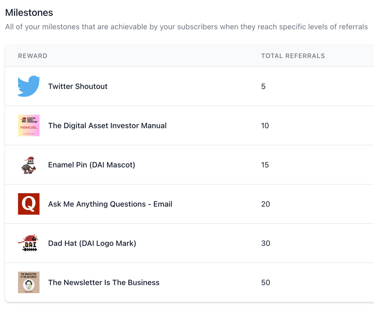 It’s a nice mix of digital products, services and real world merch, and I’ll be adding higher value swag as subscribers get closer to these referral milestones.