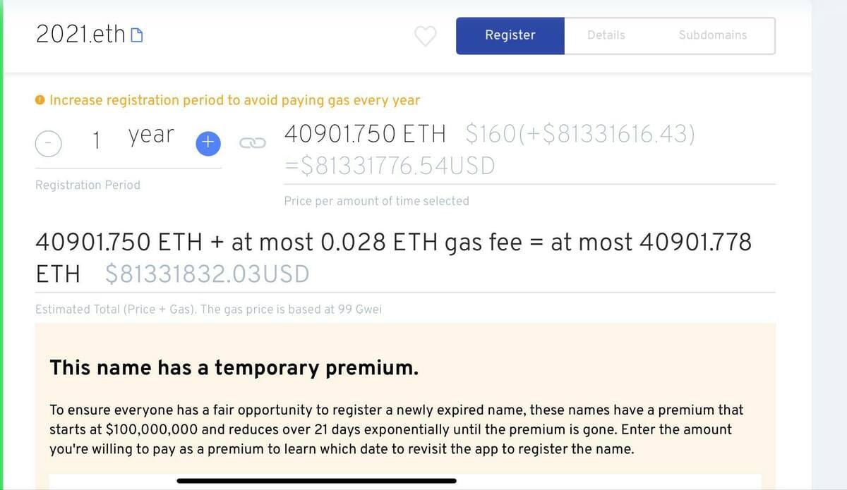 The only issue is that there is a temporary $100M (!) premium attached to all newly expired names (I did not know this) and it’s currently priced at over $80M: