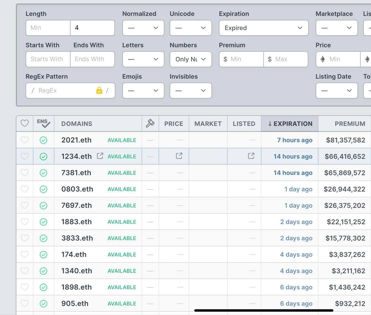 If you got to ENS.Tools you can find all kinds of names expiring or already expired. I wanted to see if I could pick up a 4 digit one, part of the 10K club whose floor has now dropped as low as 0.54ETH:
